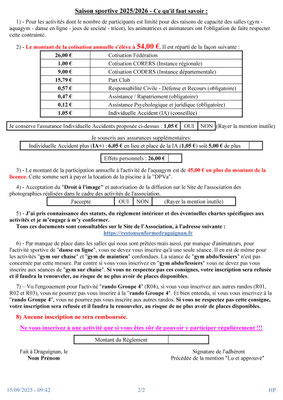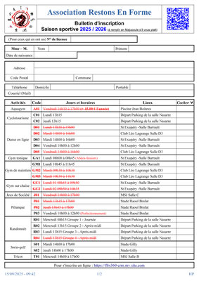 Vous pouvez télécharger le bulletin d'inscription ci-après, le remplir de façon claire et lisible, sans rien oublier et l'envoyer accompagné d'un chèque à l'ordre de "Restons en forme" à l'adresse postale suivante :